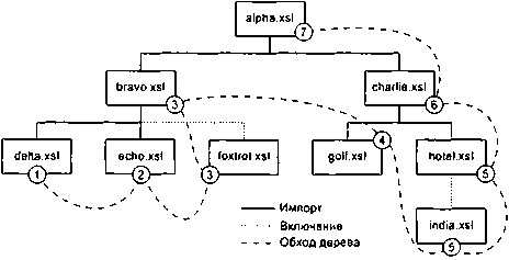 Рассмотрим преобразование alpha.xsl, которое импортирует преобразования bravo.xsl и charlie.xsl и включает преобразование delta.xsl.
